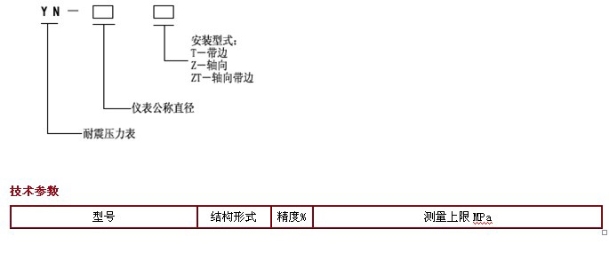 型號(hào) | 結(jié)構(gòu)形式 | 精度% | 測量上限MPa | YN-40/YN-40Z YN-50/YN-50Z/YN-50ZT YN-60/YN-60T/YN-60Z/YN-60ZT | 徑向 軸向帶邊 | 2.5 | 0-0.1; 0-0.16; 0-0.25; 0-0.4;0-0.6; 0-1; 0-1.6; 0-2.5; 0-4; 0-6; 0-10; 0-16;0-25; 0-40; 0-60;-0.1-0; -0.1-0.06; -0.1-0.15 ;-0.1-0.3;-0.1-0.5; -0.1-0.9; -0.1-1.5; -0.1-2.4 | YN-100/YN-100T/YN-100Z/YN-100ZT YN-150/YN-150Z/YN-150ZT | 徑向 軸向帶邊 | 1.6 | 0-0.1; 0-0.16; 0-0.25; 0-0.4;0-0.6; 0-1; 0-1.6; 0-2.5; 0-4; 0-6; 0-10; 0-16;0-25; 0-40; 0-60;-0.1-0; -0.1-0.06; -0.1-0.15 ;-0.1-0.3;-0.1-0.5; -0.1-0.9; -0.1-1.5; -0.1-2.4 |