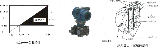 絕對壓力變送器用途 絕對壓力變送器的δ室(見下圖)一側(cè)接受被測絕對壓力信號,另一側(cè)被封閉成高真空基準室,然后將其轉(zhuǎn)換成4~20mA.DC信號輸出。它可以測量除氣系統(tǒng)、蒸餾塔、蒸發(fā)器和結(jié)晶器等的絕對壓力。 絕對壓力變送器性能以及參數(shù) 輸出信號:4~20MA.DC二線制(模擬)二線制4~20mA直流信號上疊加數(shù)字信號,由用戶選擇線性或開方輸出。(智能)供電電源:12~45V.DC(詳見負載特性圖)負載特性:電源影響:<0.005%輸出量程/V負載影響:電源穩(wěn)定時,無負載影響。測量精度:調(diào)校量程的±0.1%,±0.2% (標配精度為±0.2%,若選擇其他精度請在訂貨選型時注明。)量 程 比:1:100或1:10阻 尼:通??稍?.1至16秒之間任意可調(diào)。啟動時間:<2秒,不需預熱工作環(huán)境:環(huán)境溫度 -29~93℃(模擬放大器)-29~75℃(數(shù)字/智能放大器)-29~65℃(帶顯示表頭)環(huán)境濕度 0~95%防護特性:防護能力 IP65防爆類型:隔爆型 Exd II BT4-6本安型 Exia II CT5靜壓影響:零位誤差:±0.5%最大量程限值,對于32MPa在管道壓力下通過調(diào)零給予校正。電磁輻射影響:0.05%最大量程值,接受輻射頻率27~500MHz,試驗場強3V/m。指示表(%):液晶數(shù)顯 精度±0.2%振動影響:任何方向200Hz振動時,±0.05%/g。安裝位置:膜片未垂直安裝,可能產(chǎn)生小于0.24KPa的零點誤差,但可通過調(diào)零來修正。重 量:3.9Kg(不包括附件) 絕對壓力變送器