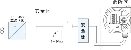 在系統(tǒng)回路中必須采用屏蔽信號(hào)電纜,并可靠接地。 本安型測(cè)量系統(tǒng)示意圖(4~20mA)