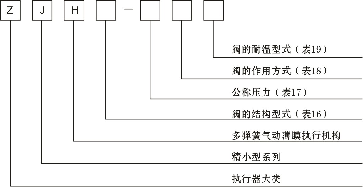 本產(chǎn)品型號由兩小節(jié)組成,第一節(jié)包括四位代號,表示本產(chǎn)品大類及組成的執(zhí)行機構和閥的